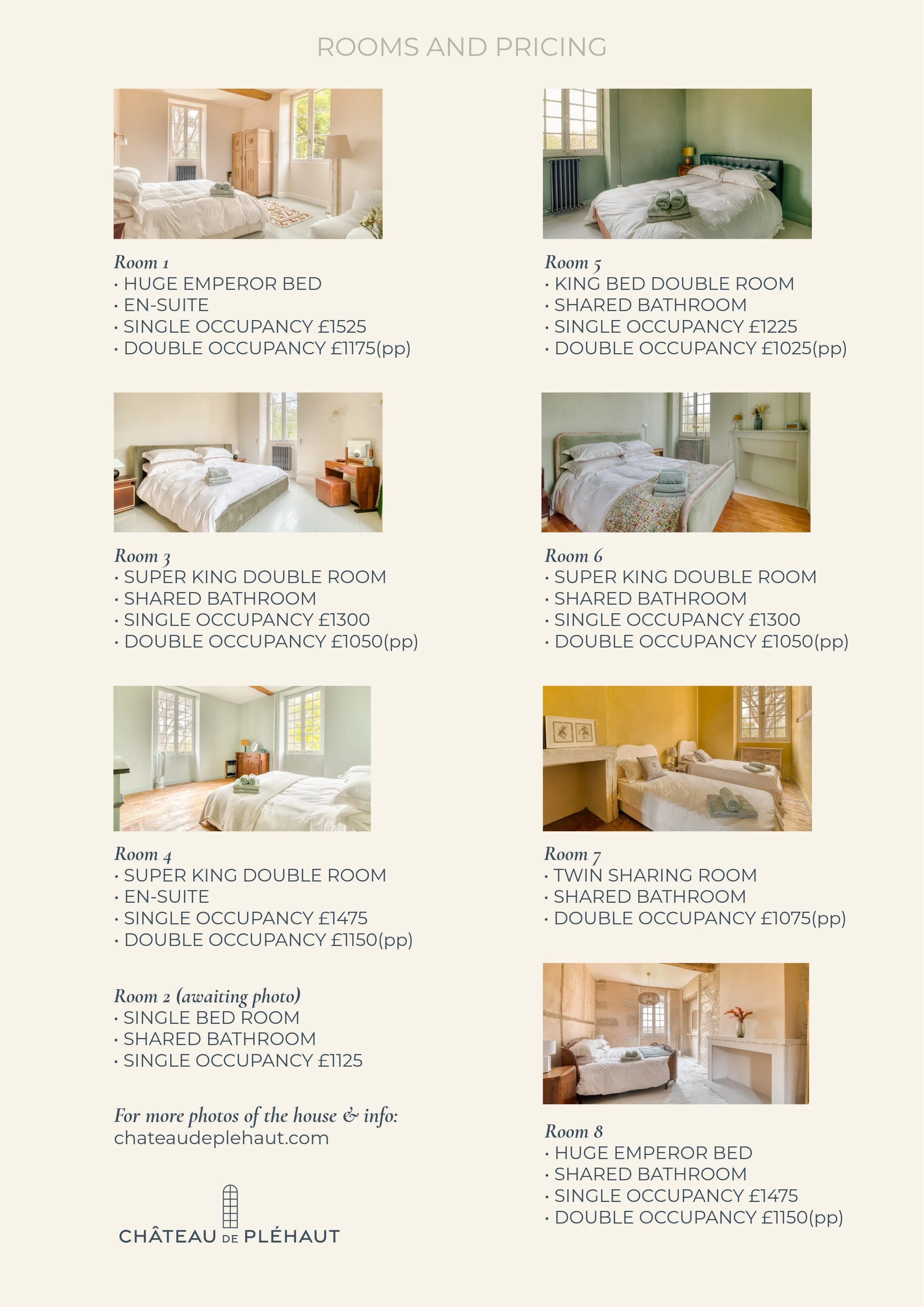 Contact us with your chosen room and number of people (if you're solo and want to buddy up that's great, we'll work out rooms).